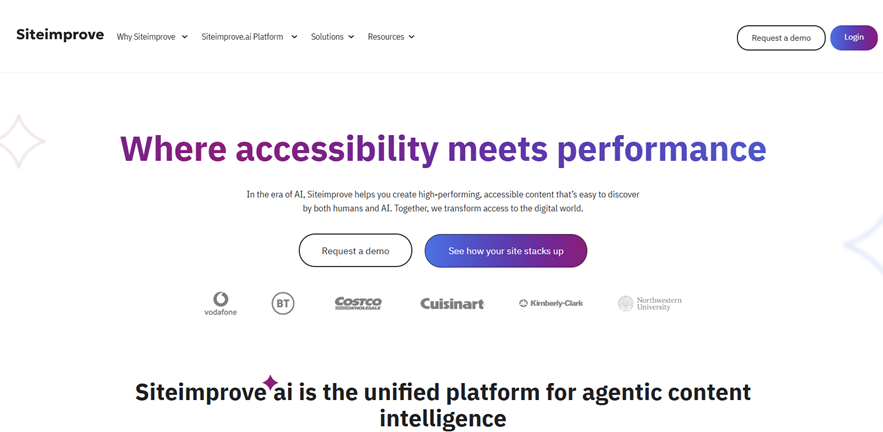 Siteimprove built its platform specifically for enterprise complexity. It handles JavaScript rendering, dynamic content, and regulatory compliance as core functions. For teams managing sprawling digital properties across multiple markets, this is essential.