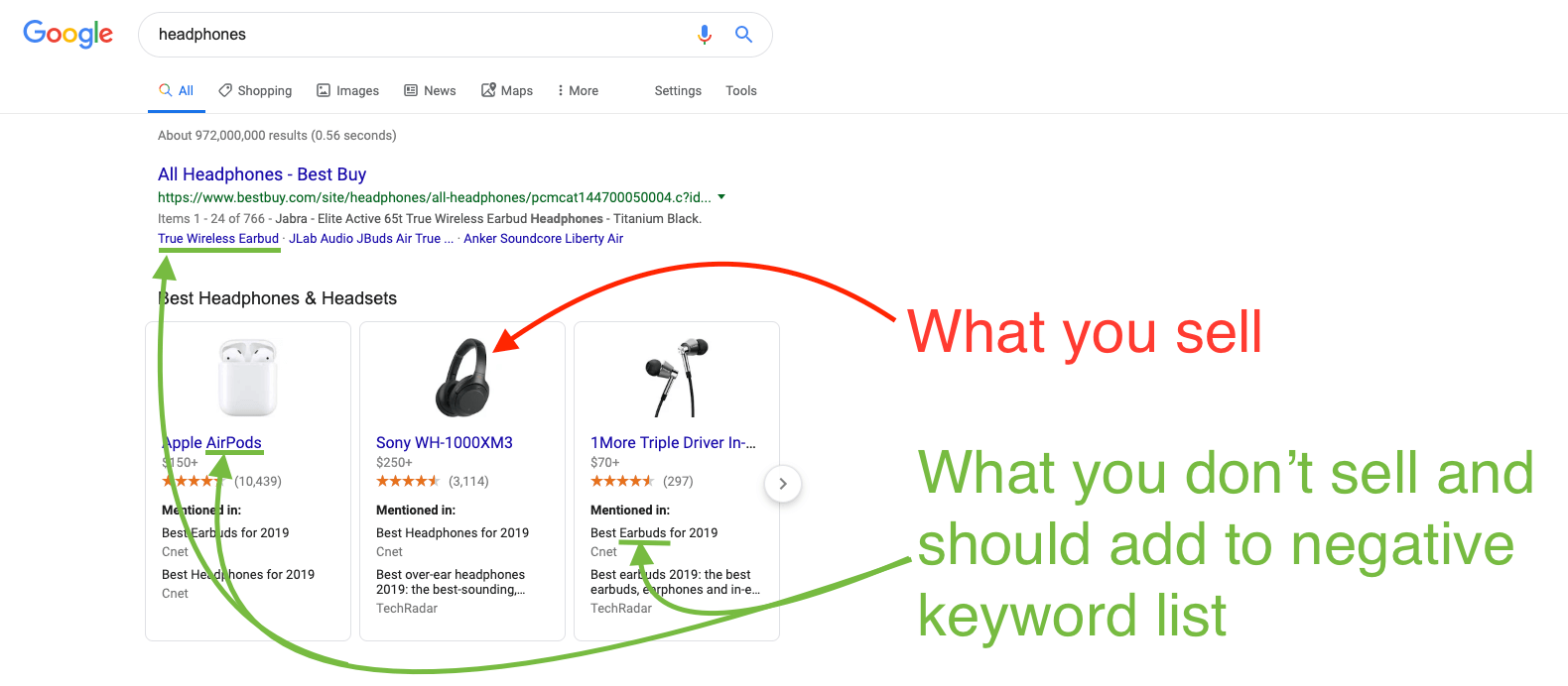For example, if you’re advertising headphones (just regular, over-ear headphones), when you do a Google search yourself for “headphones,” you might find a lot of irrelevant results. You might see results for sport headphones, wireless earbuds, etc. That can help inform your negative keywords: you need to include “sports,” wireless,” and “earbuds” in your negative keyword list.