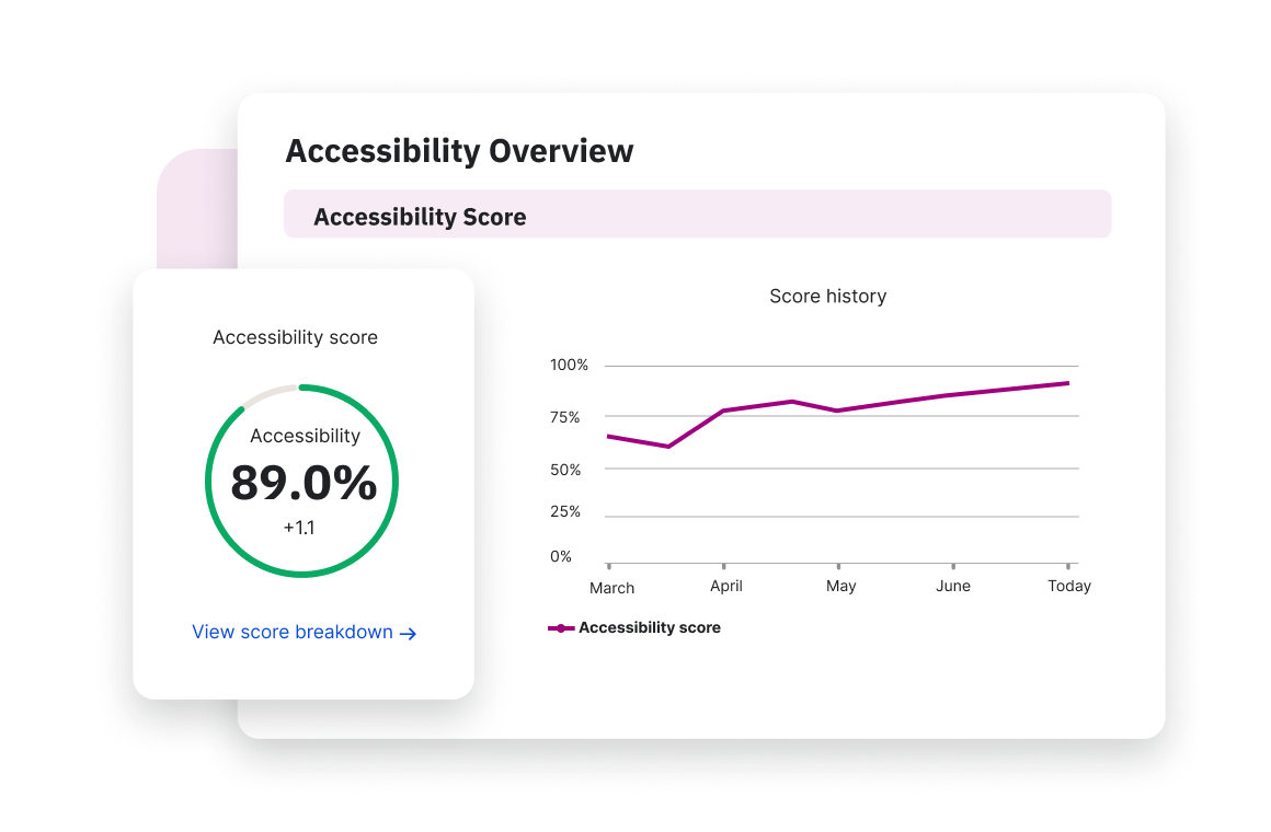 Get a real-time view of your organization’s accessibility posture across every site and brand. Prioritize issues by business risk, track progress against internal policies and external regulations, and report improvements in a way that legal, compliance, and executives will actually trust.