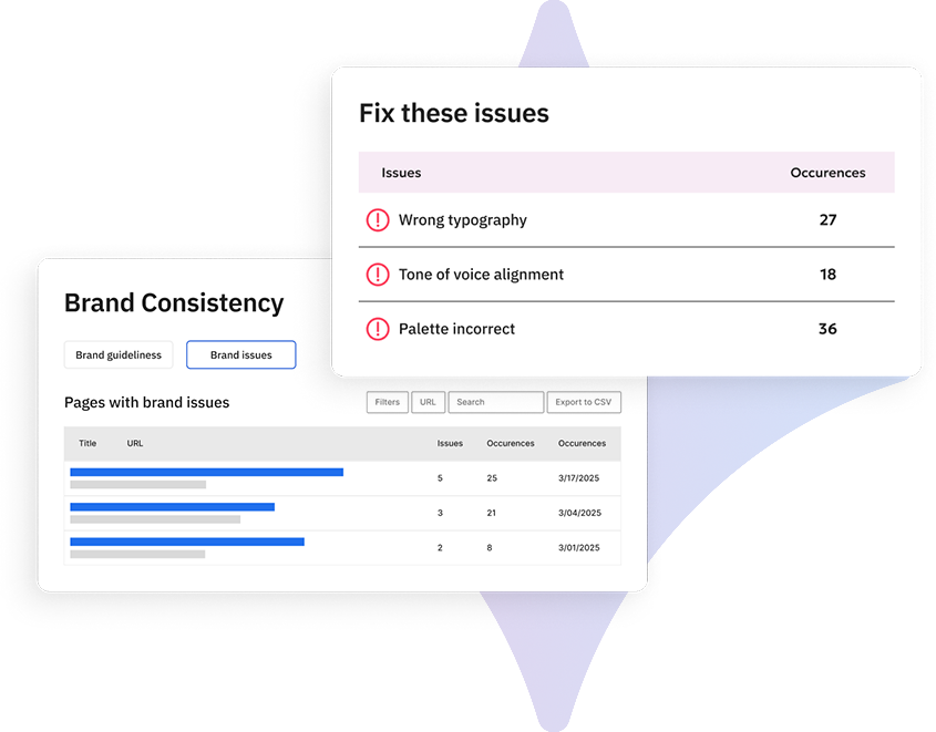 Siteimprove automates your brand compliance. We transform your static style guides into dynamic, automated policies that check content as it's being created. You can mirror your brand book in Brand Consistency to validate content for visual styles and tone of voice guidelines. This frees up your brand team to focus on strategy instead of policing copy and empowers your content creators with the guardrails they need to produce on-brand content, faster.