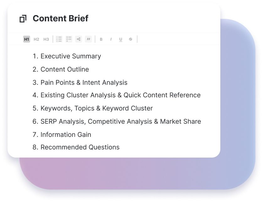 Generate AI-powered briefs with outlines, internal links, and persona-specific guidance. Customization options ensure brand consistency, tone, and compliance across teams and workflows.