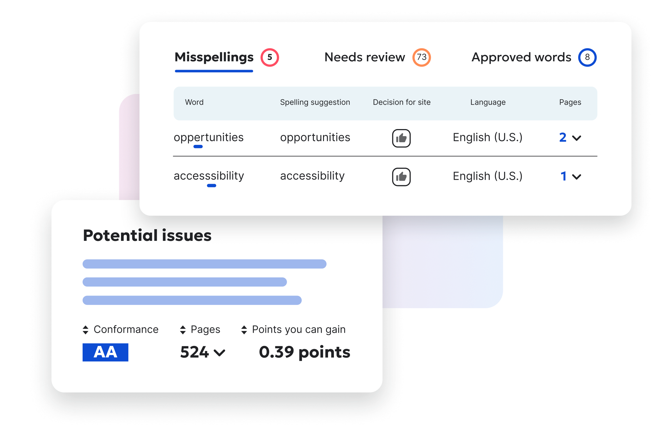 Web estates are ever-expanding with tons of content being published every day — meaning any number of issues can be introduced at any time in the form of broken links, misspellings, and speed or accessibility issues. Our platform does the legwork of finding these issues and guiding you through the necessary fixes, so you can focus on forward-thinking initiatives that will move the needle.